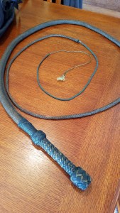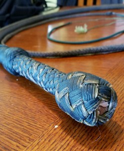 Some things I like about the whip. It rolls out pretty good, it is very easy to crack and it feels substantial when you hold it and swing it. I really like the double ended weighted fall. I also like that the chocolate brown paracord has a very leather-like look to it, especially after it was waxed. As soon as someone gets home to hold the camera (I don’t have a tripod) I’ll post some video of it being cracked.