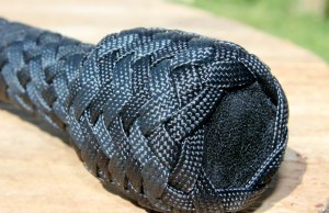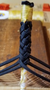 I had bought a 1000 foot roll of black 550 for this whip, but I had another 1000 ft roll that I had used for some earlier whips and bellies that I had bought from another supplier that was a slightly different hue and I used 10 strands of the lighter black to do the interweave on the handle. The heel knot is a 15L 8B pineapple knot over a leather and sinew foundation and the transition knot is a smaller 11×6 pineapple knot without the underlying leather foundation.