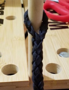 The English eye fall hitch requires that the whip overlay be plaited from the tip of the whip rather than the heel and this means that you have to add strands and the core to the whip instead of drop them. It actually was much easier than I thought it would be and the whip turned out very nice.