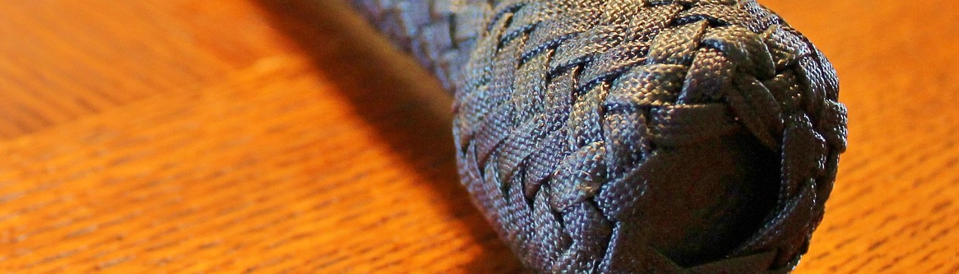 The handle overlay uses a diamond plait for it’s entire length, which switches to a short herringbone pattern at the transition. The short herringbone continues for another 12 inches before transitioning back through a diamond plait into a regular herringbone plait. The heel and transition knots are 15 x 8 pineapple knots and there is a Spanish ring knot at the transition from the short herringbone to the regular herringbone plait.
