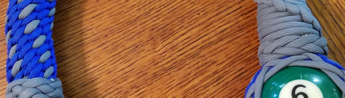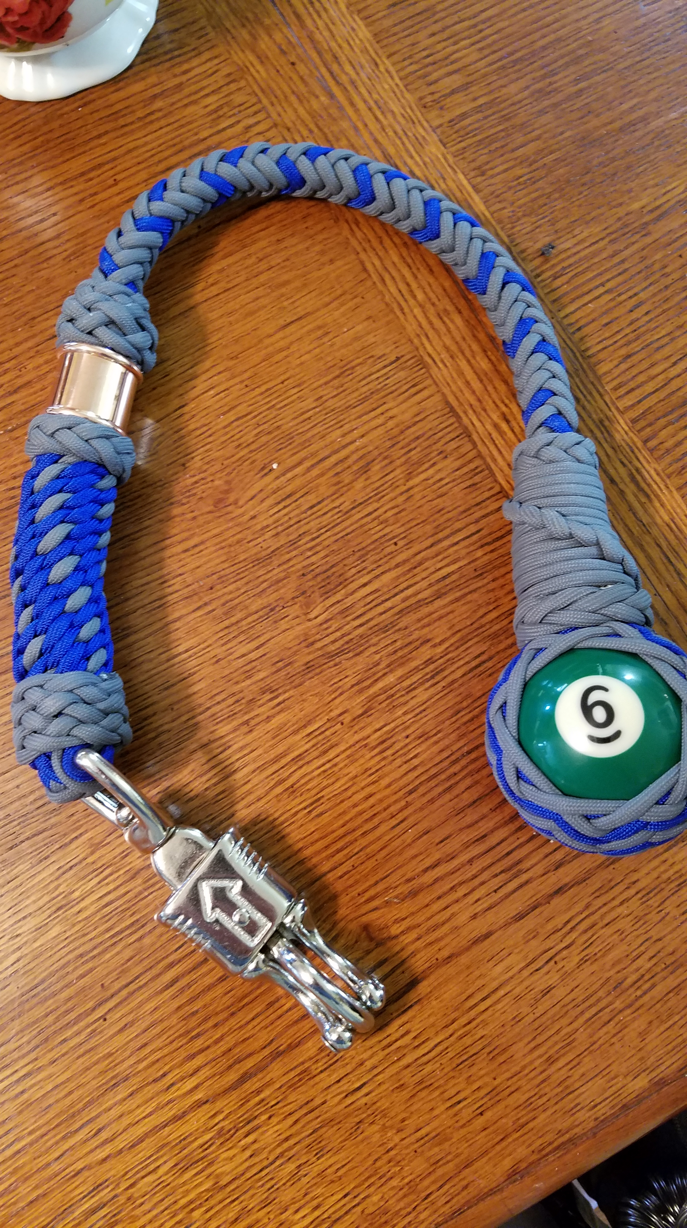 The GBW is 24 inches overall with a 6 ball wrapped in a pineapple knot leading into a 4 strand round braid that attaches the ball to the panic snap and acts as a core for the 8 strand herringbone plait that leads back down to the ball and terminates in a French spiral decorated with Spanish ring knots. the handle is a six strand round sennit with a 7×6 Turk’s head heel knot and a copper collar held in place by another THK and a Spanish ring knot.