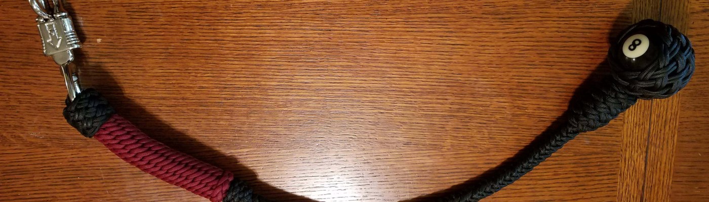 And this is a 29 inch long get-back whip. I started this with four 20 ft strands of paracord and made a 9×8, 2 pass Turk’s head knot in an open weave to hold the 8 ball, brought the ends together to form an 4 strand Matthew Walker knot (that was later hidden beneath the THK) and then braided a 4 strand round braid up to the panic snap. After running the cords through the snap I added 4 more and plaited 8 strands back down the whip to the 8-ball and tied it off with artificial sinew. Then I used an 8 strand over-2 round sinnett to form the handle and ended it with an 8 strand diamond knot, followed by a 7×6 TH. The heel knot is also a 7×6 TH but doubled to add a little size to it. The knot above the 8-ball is an 11×4 doubled THK. The whip was waxed using paraffin and coconut oil.