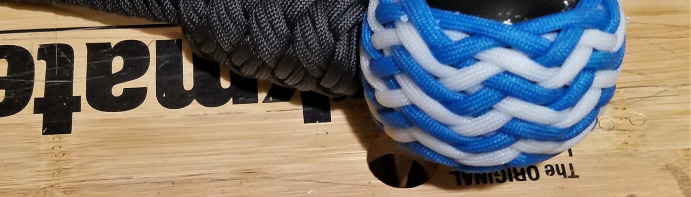 Here’s a get-back whip custom made for a customer. The whip is 36 inches long, overall in black and white and baby blue. The knot holding the 8-ball is a 9×8 Turk’s head knot with a pineapple interweave. The core is a 4 strand round braid covered by an 8 strand whip maker’s plait. the handle is 16 strands in a short herringbone with a contrasting center section that uses a stair-step and diamond pattern. The heel knot is a 7×6, three pass Turk’s head, the transition is a 5×4, three pass Turks’s head and the knot at the 8-ball is an 11×4. three pass Turk’s head.