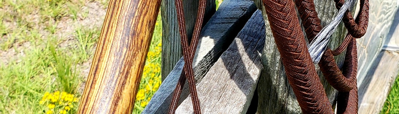 Here’s an 8′ cow whip in chocolate brown with a 14″ bocote handle, un-weighted 28″ fall, and a twisted-tapered core. The last foot of the overlay is also a twisted-taper and the ends of each of the 2 bellies are twisted into the core or belly below it as well. the core is bound with a closed-loop binding. the cracker is an 8″ and is twisted of Fast Flight bowstring material. Whip # 44.