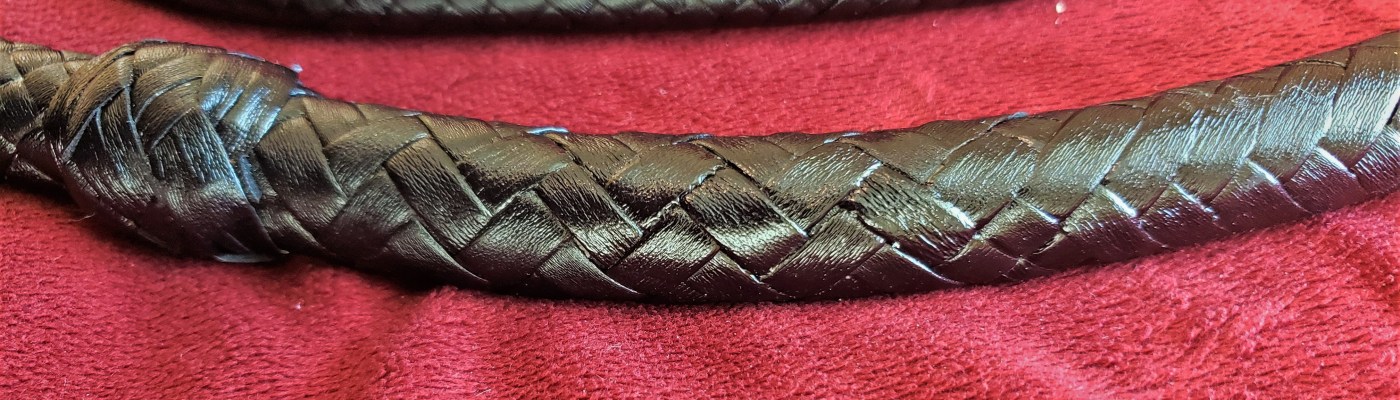 Whip #47 is a solid black bullwhip, 7 ft long, with a 10-inch handle built around a 1/4 inch spring steel rod. The core, the 1st belly, and the 2 bolsters are deerskin and the second belly and the overlay are kangaroo hide. It has a 12-plait overlay in black kangaroo hide ending in an 8-strand traditional fall hitch. It has a 32-inch latigo fall and a 12-inch Fast Flight cracker. The heel is weighted and covered with a 5×4, 3-pass Turk’s head knot and the transition has a 5×4, 2 pass THK covering it.