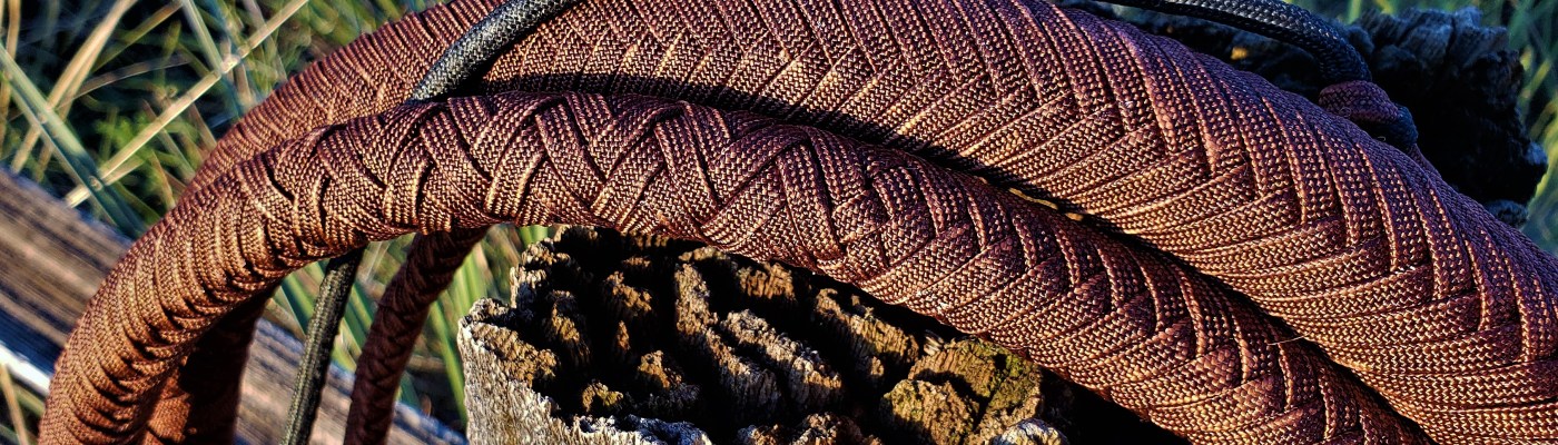 This is a 10′, 3 belly, nylon whip with a 10″ handle built around a 1/4″ spring steel rod and a twisted, tapered core. The core and bellies are bound in artificial sinew. The overlay is 20-plait and it has an English eye fall hitch, a 24″, weighted, double loop fall, a 10″ cracker made of Fast Flight bowstring material. The heel knot is a 3-pass 7×6 Turk’s head knot built around a leather and lead foundation and the transition knot is a Small Pampas Knot, plate 180 in Bruce Grant’s Encyclopedia. The whip is waxed. This is my 48th whip.