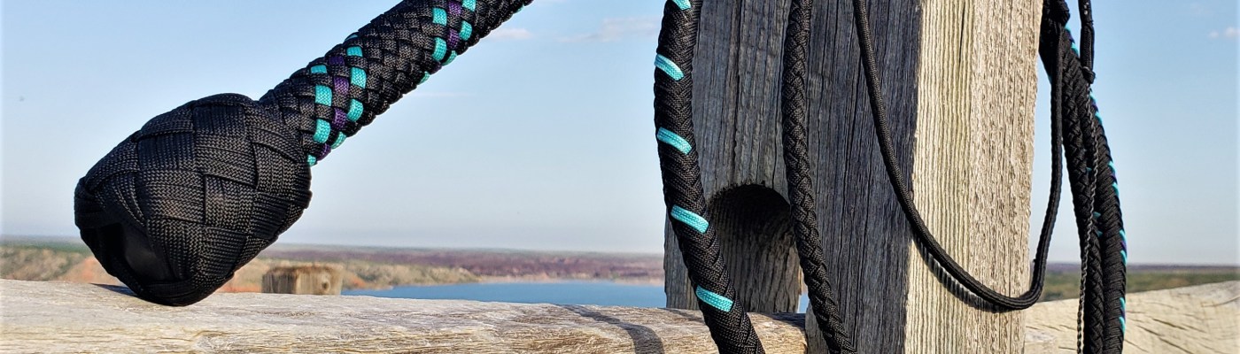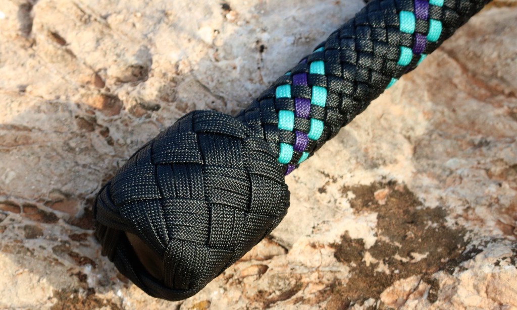 Whip #59 is a 7-foot nylon whip with 2 bellies around a twisted-tapered core. The fall hitch is an English eye. It has a 10 inch 3/8-inch steel rod in the handle. The overlay is 16-plait in black with turquoise and purple highlights that reminds me of the color spot behind the eyes of a local bird called the Northern Roadrunner. The heel knot is a 7×6, three-pass Turk’s head over a lead and leather foundation. The transition is a 10-inch long back-braided Gaucho knot (Grant’s Encyclopedia plate #41 “Back-braid of 6 thongs” that I doubled to 12 thongs making it a 24-plait.) It has a 20-inch weighted, double loop fall and a 10 -inch B55 nylon cracker.