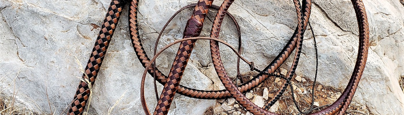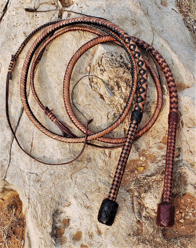 Here are a couple of 6-foot, 12-plait kangaroo hide bullwhips. The handle is plaited around a 1/4-inch spring steel rod 10 inches long. They have 3 bellies, a 24-inch latigo fall, and an 8 inch cracker made of B-55 bow string material. The thong ends in a traditional 8-plait fall hitch. One is black and natural and hs a bird’s eye pattern over the transition. The other is burgundy and natural with a gaucho plait at the transition. The heel foundations are leather and lead and the heel knots are 8×5 Turk’s heads. The transition knots are 5×4 THKs. These ar whips #60 and #61.