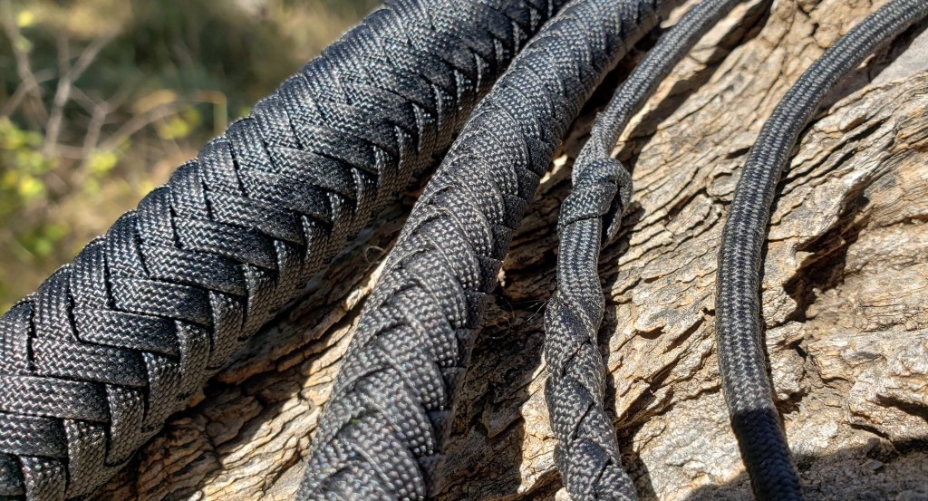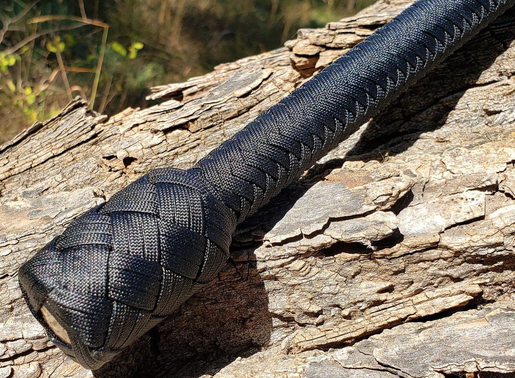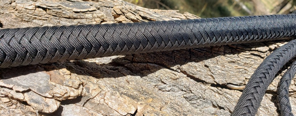 Whip # 62 is a black, 7-foot, paracord whip with a 13-inch steel handle core. It has a twisted-tapered core, 2 bellies and a 16 plait overlay. The heel is weighted with lead and covered with an 8×5, 3-pass Turk’s head knot. The transition knot is a 3-pass, 4×5 Turk’s head knot. It has a 30 inch double-loop weighted fall and a 10-inch cracker made from B55 bowstring material. The whip is waxed.