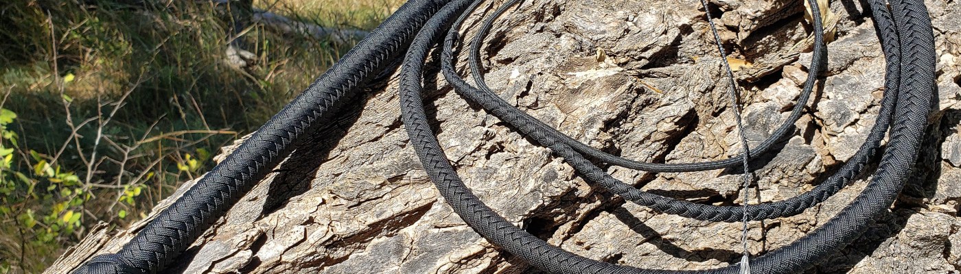 Whip # 62 is a black, 7-foot, paracord whip with a 13-inch steel handle core. It has a twisted-tapered core, 2 bellies and a 16 plait overlay. The heel is weighted with lead and covered with an 8×5, 3-pass Turk’s head knot. The transition knot is a 3-pass, 4×5 Turk’s head knot. It has a 30 inch double-loop weighted fall and a 10-inch cracker made from B55 bowstring material. The whip is waxed.