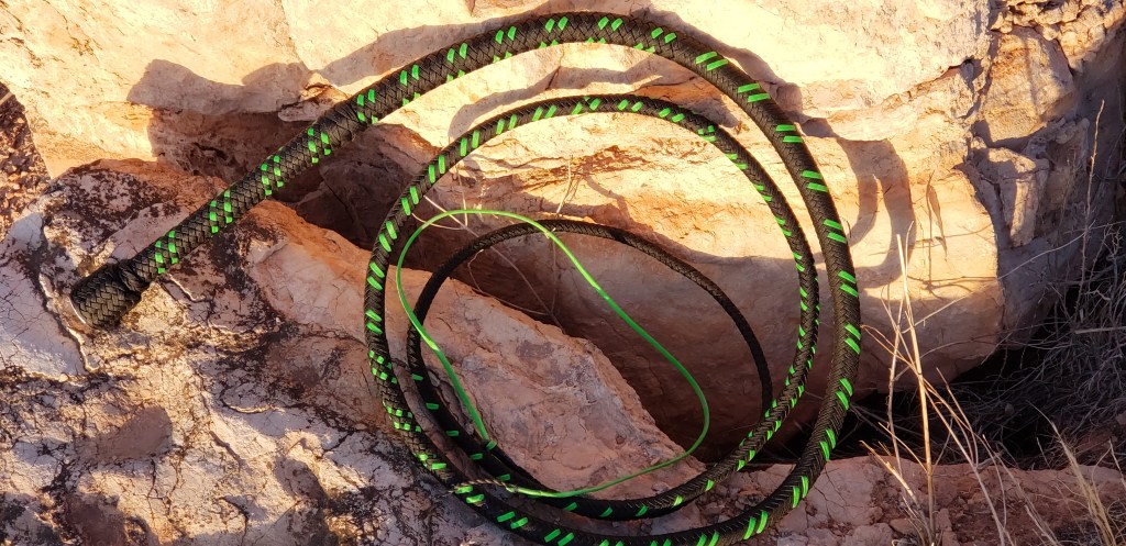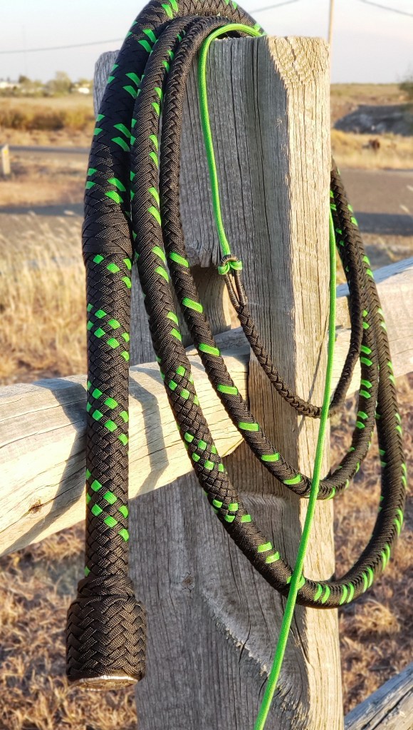 Here is whip number 63, a 16-plait 10-foot nylon whip with a 10-inch handle in black and neon green. It has a 10 steel rod in the handle, a twisted-tapered core and 3 plaited bellies bound with artificial sinew. The heel knot is a pineapple interweave in a 9×8 Turk’s head knot and the transition is a 5×4, two-pass THK. It has a 30 in double looped fall and a cracker made of B%% bowstring cord. The whip is waxed.