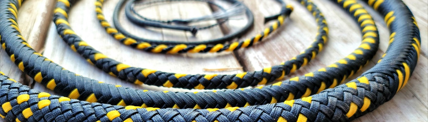 Fool’s Gold is a 8-foot, 11-inch nylon cow whip with a 12 inch African Blackwood handle. The core is shot loaded to 24 inches, it has two plaited bellies, and a 16 plait overlay in black and gold. The 25-inch fall is weighted and it has a 10-inch cracker made of B55 nylon. The whip is waxed. This is whip #66.
