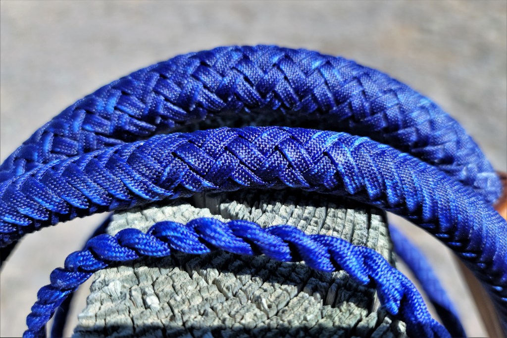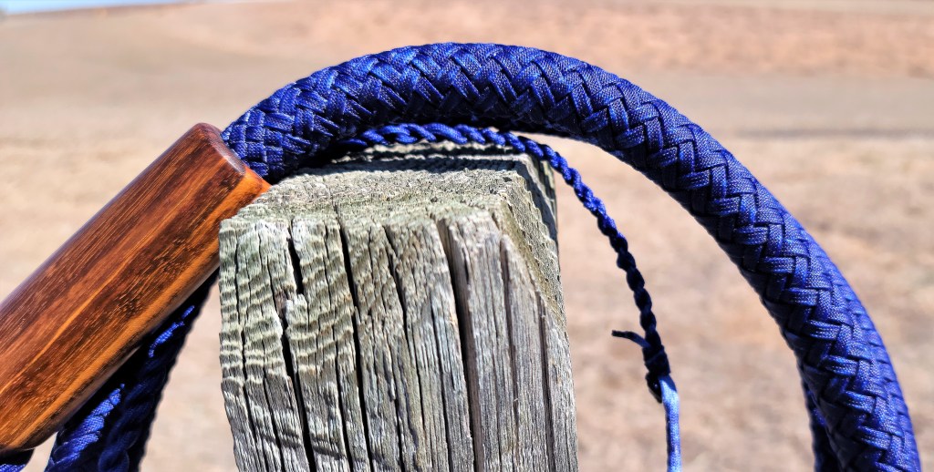 Whip #69 is a 16- plait, 9-foot cow whip in electric blue paracord. The handle is 12 inches long and is made of Goncalo Alves hardwood, This whip has 2 plaited bellies around a 24-inch weighted core, and a 24-inch weighted fall, The whip is waxed.