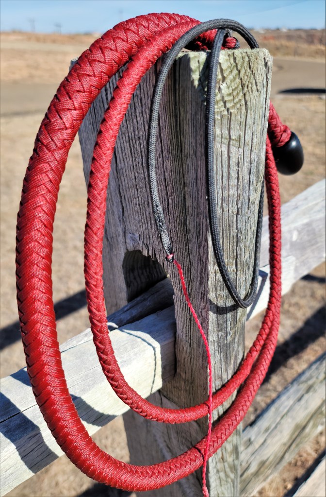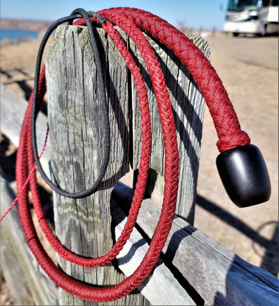 Whip #71 is a 6-ft, Imperial Red snake whip. It has a weighted, twisted-tapered core, a single plaited belly and a 12-plait overlay. The fall hitch is an English eye and the double-loop fall is 24 inches long with a 10 inch B55 nylon cracker. The heel is carved from Indian ebony. The whip is waxed.