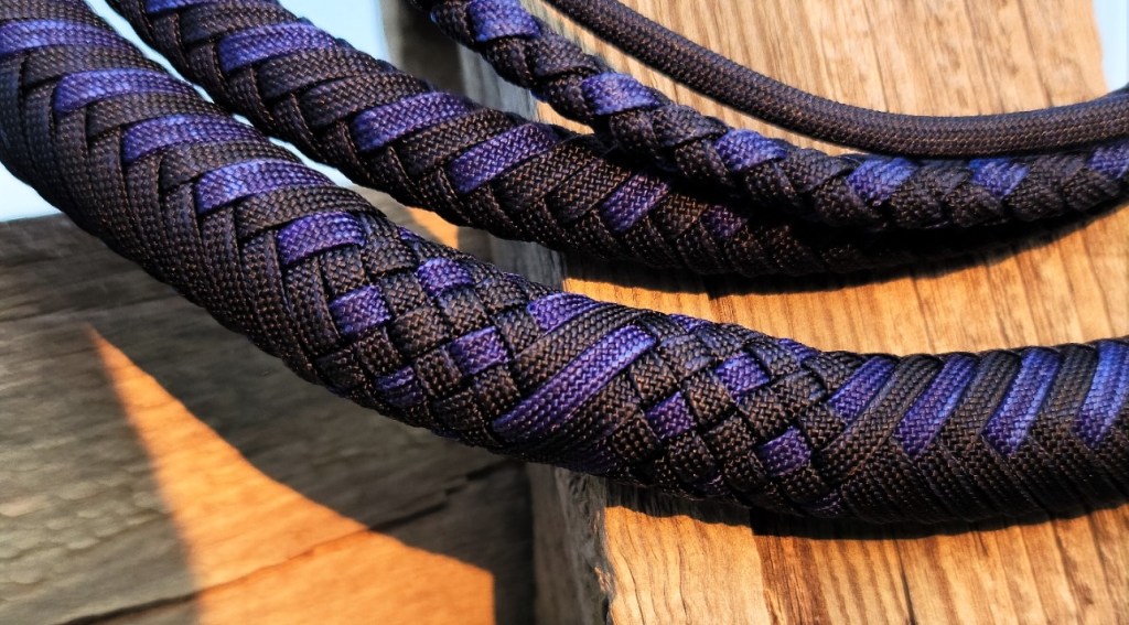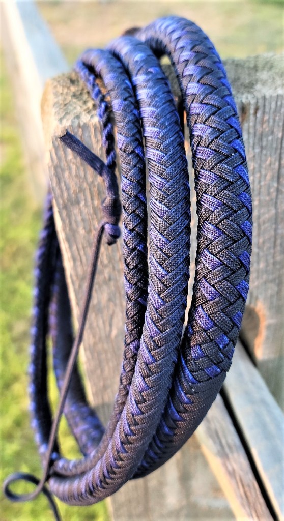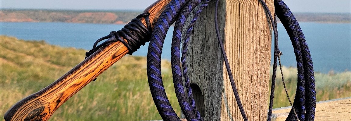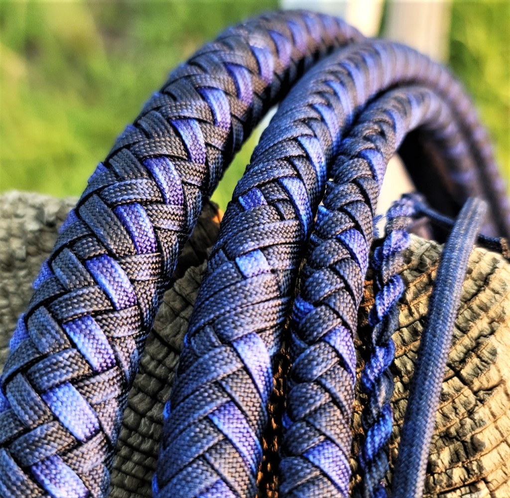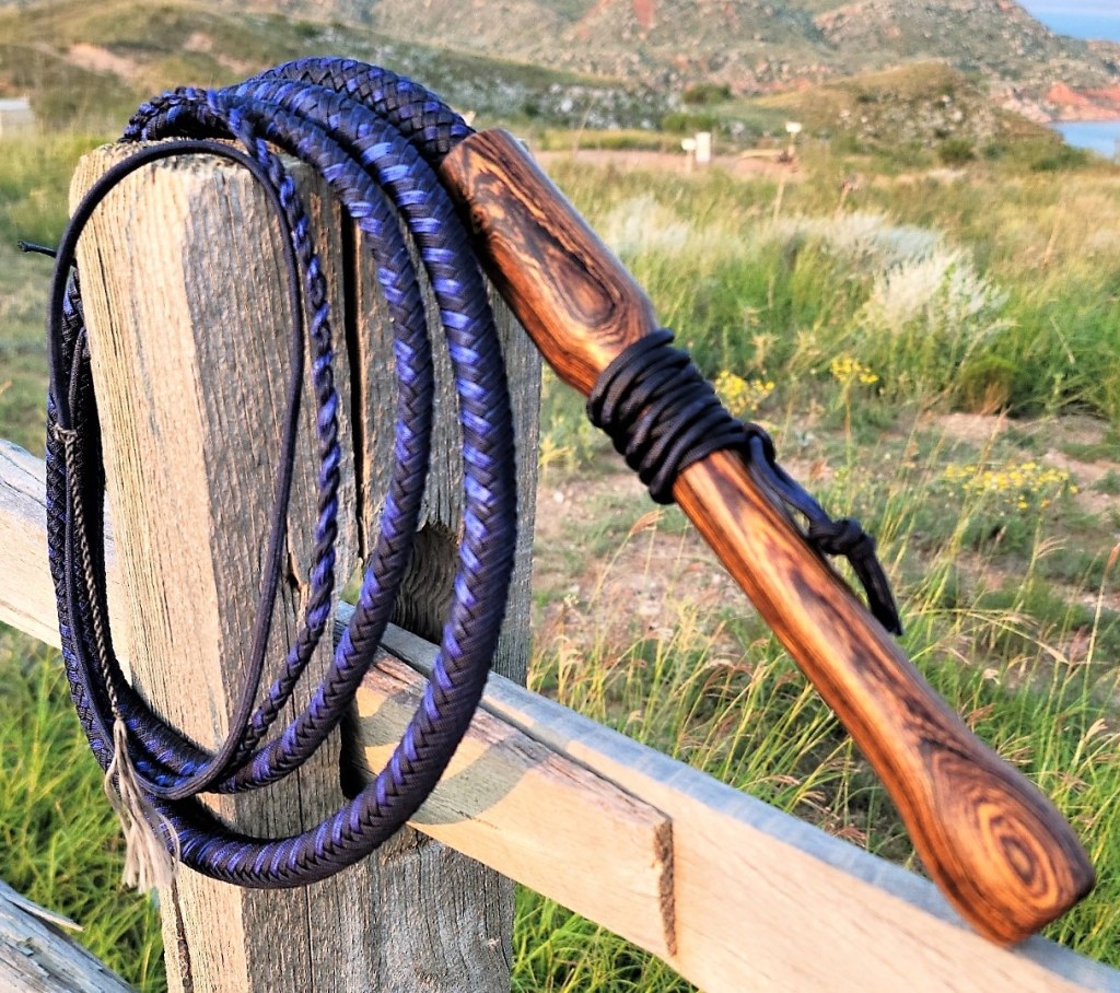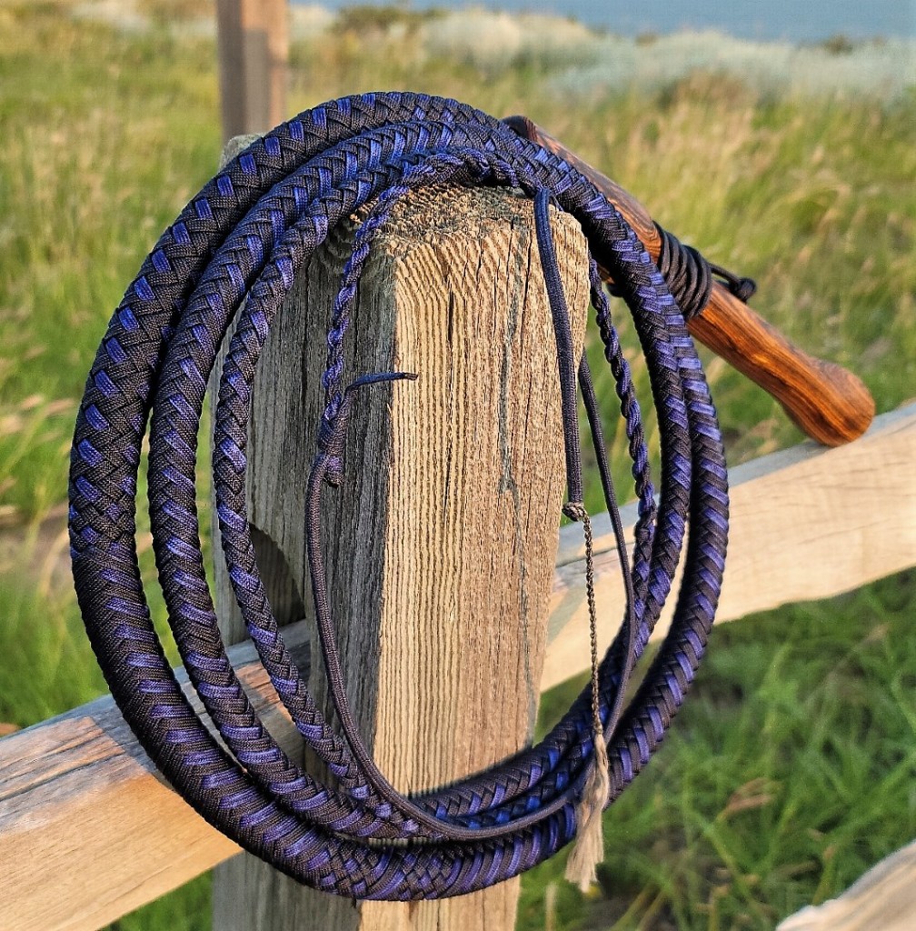 This 8-foot nylon cow whip is whip #77. It has a 16-plait overlay in midnight blue and electric blue paracord over a twisted-tapered core and two plaited bellies, a 12-inch Bubinga handle, and a 24-inch fall. The whip has been waxed.