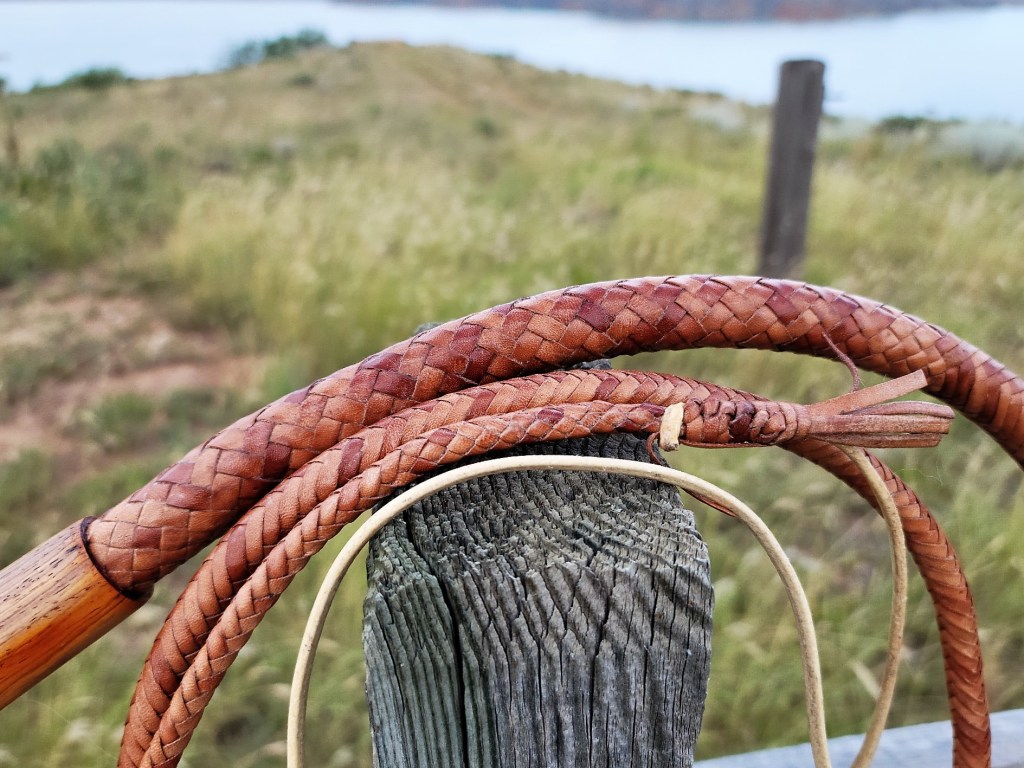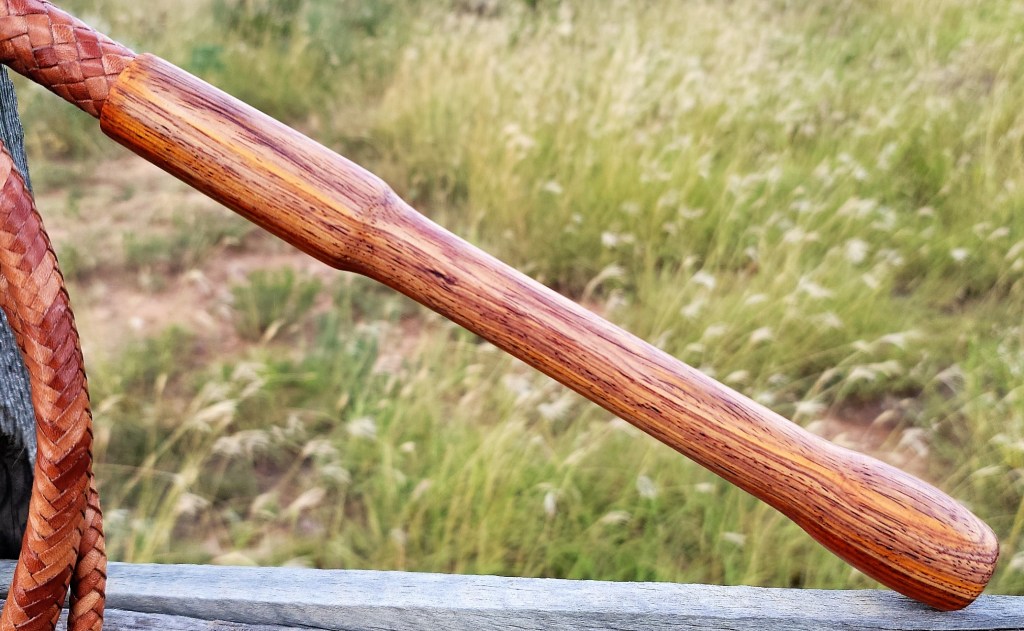 Whip #78 is an 8-foot, 16-plait, wooden handled, kangaroo hide bullwhip with an 11-inch Cocobolo handle and a 24-inch whitehide fall. It has 2 plaited bellies and a single bolster around a 24-inch, rolled, tapered core, all of kangaroo hide. The whip thong has been shellacked and the handle finished with Tung oil.
