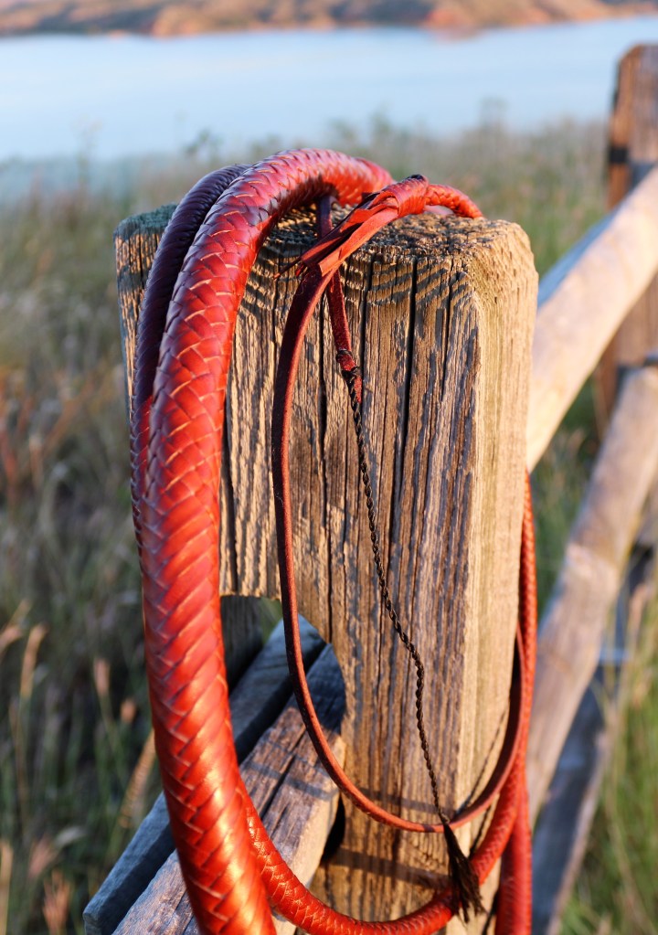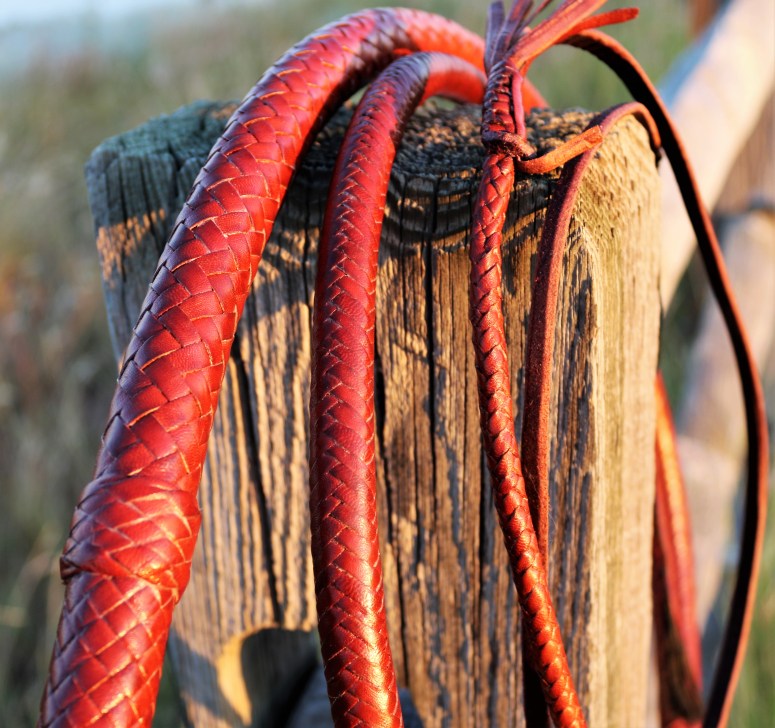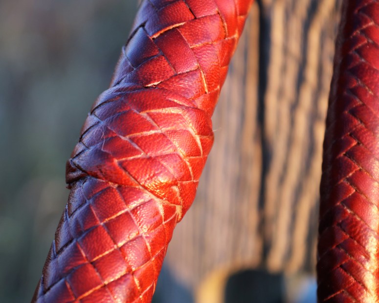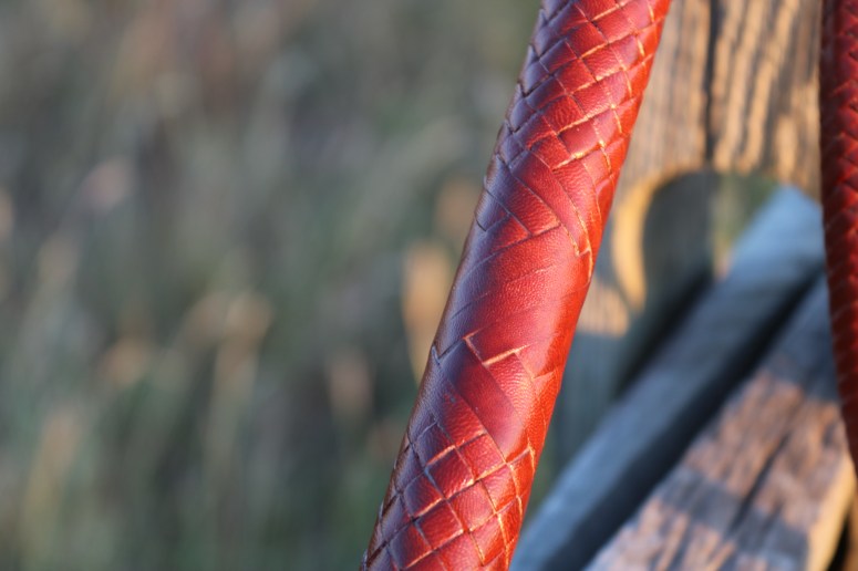 Here’s a 7.5-foot, 16-plait, saddle tan, kangaroo hide bullwhip with 2 bellies and 2 bolsters around a rolled core. The bolsters are kipskin and the core, bellies, overlay and knots are kangaroo hide. The handle is in a diamond plait with a section of bands as decoration. the thong starts with a gaucho plait and transitions into a herringbone plait after about 10 inches. It has an 8-strand fall hitch, a 30-inch latigo fall and a B55 nylon cracker. This is whip #81.