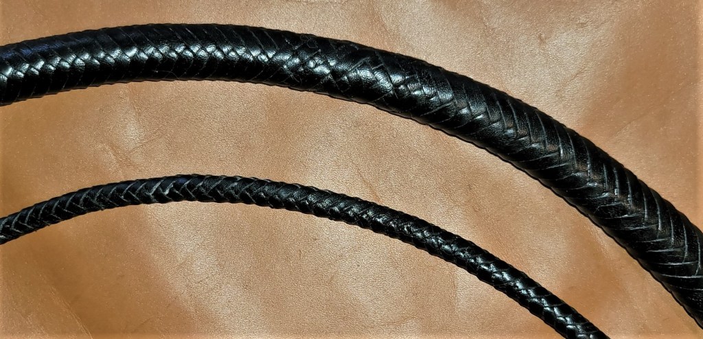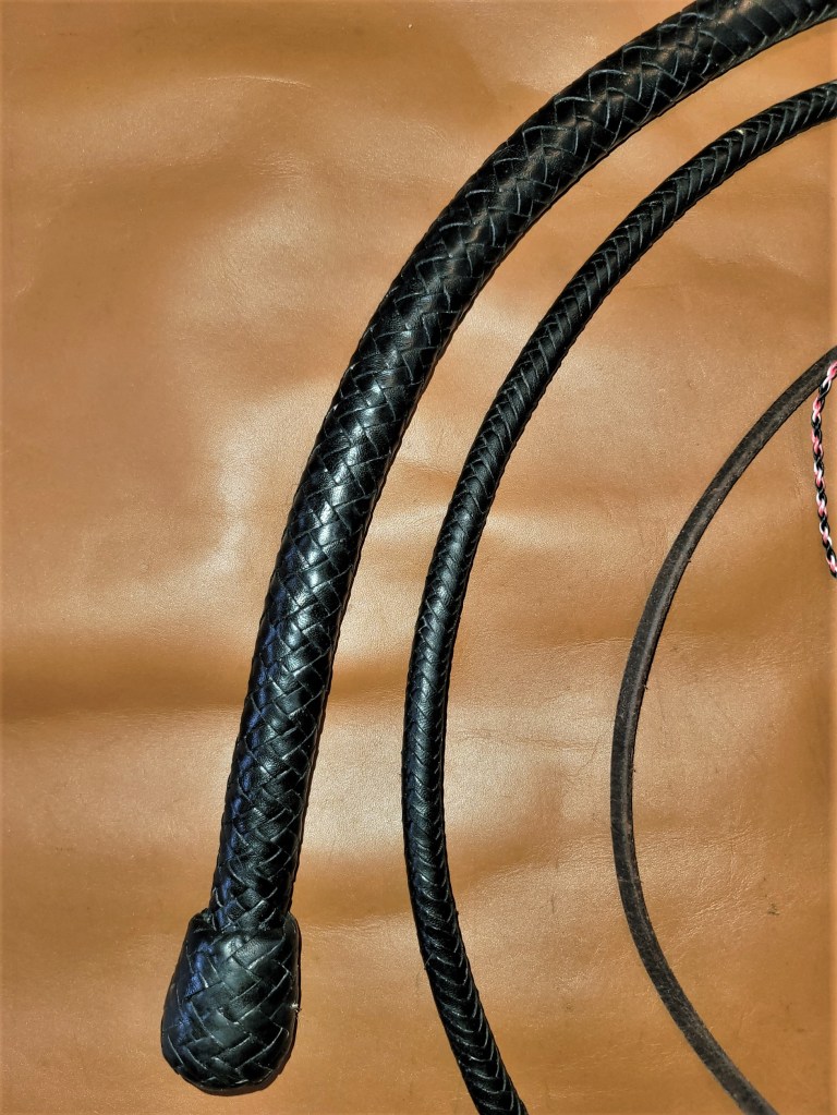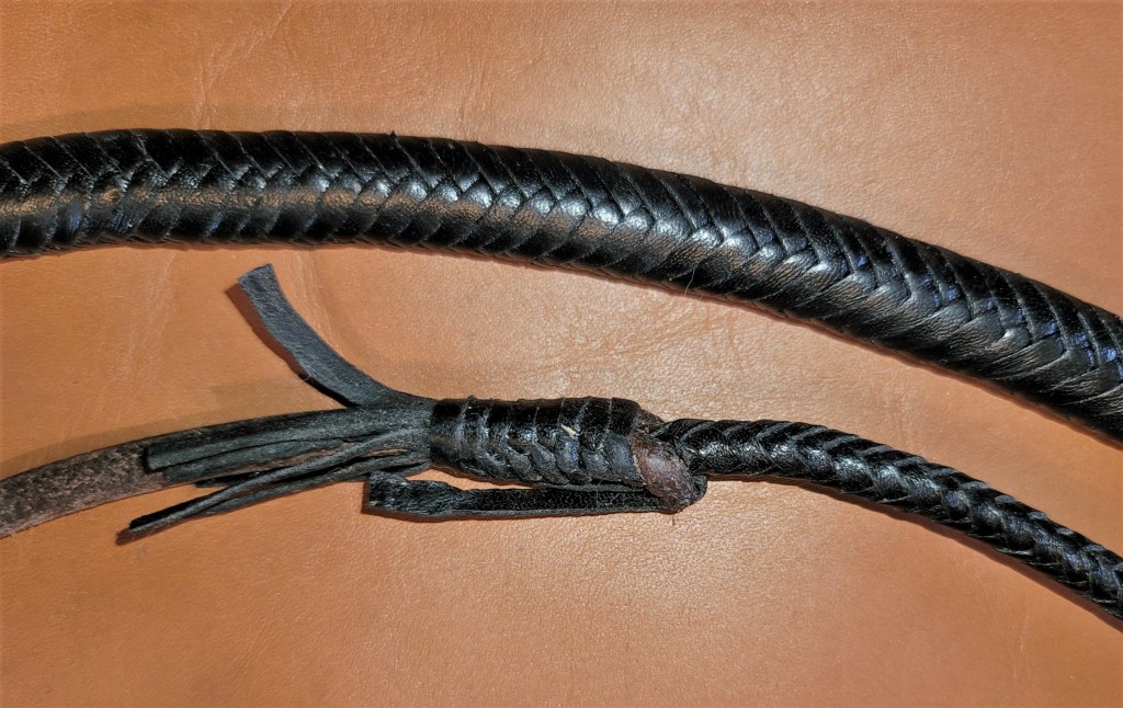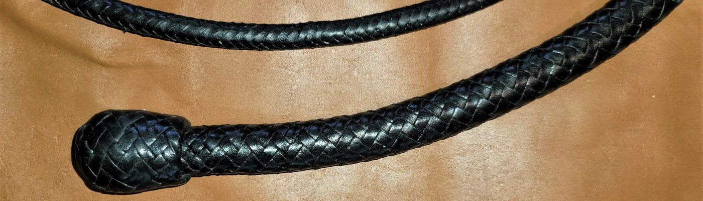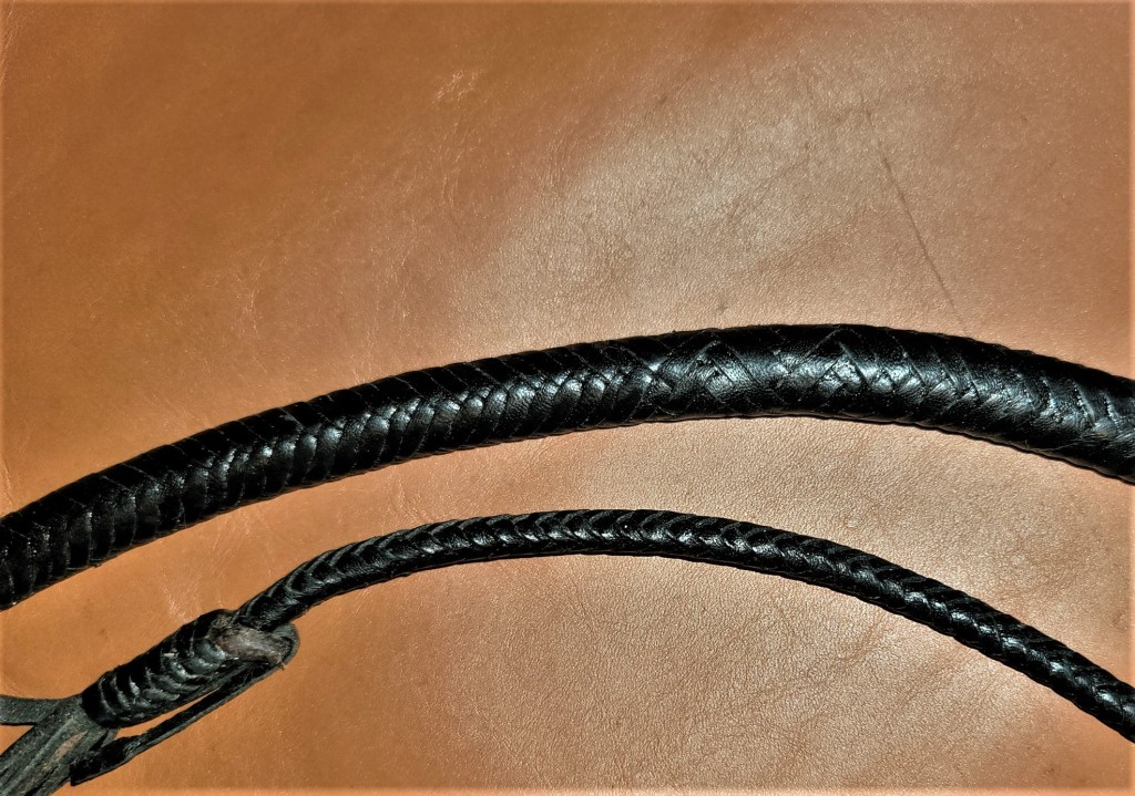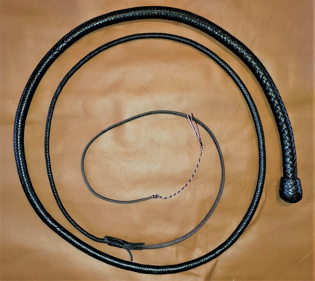 This is an 8-foot, kangaroo hide, snake whip with 3 plaited bellies around a shot bag core. It has a 16-plait overlay that ends in an 8-plait traditional fall hitch and a 34-inch latigo fall. The heel foundation is made from lead and the heel knot is a 7×6 Turk’s head knot with a gaucho interweave. This is whip #82.