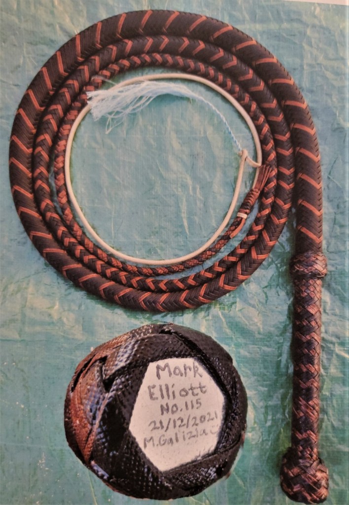 First is the Bernie copy. It wasn’t a copy of Matt’s Bernie, it was a copy of my whip! Matt had made it using the photos and descriptions of the whip from my post a few years ago. There are a few differences of course. One is that the original Bernie whip is kangaroo hide and this one is paracord, which brings us to the second difference; 550 paracord is approximately 4.5 mm wide (different manufacturers vary) and kangaroo strands can be cut to any width you want, so in order to match the diameter of the original whip he had to use 20 strands of the paracord to cover the same as 16 of the wider cut kangaroo lace, which means that the patterns aren’t exactly the same (not so noticeable, though) and he had 4 more strands to drop during the plait than Bernie did. Finally, most kangaroo hide bullwhips end in an 8 strand fall hitch with the strands being about 3mm thick. Matt ended this whip in an 8 strand fall hitch as well but since the paracord strands are still 4.5 mm wide, the tail of the whip and the fall hitch is slightly bulkier than the original. The difference is not that much, though.