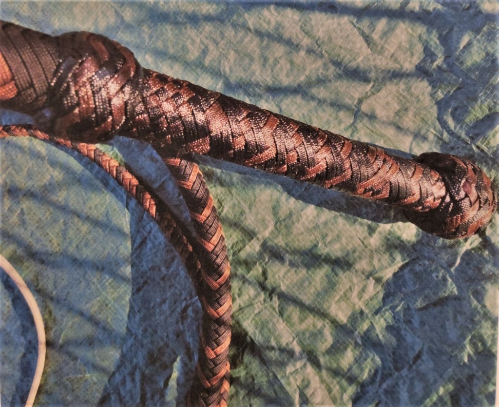 Now for the barber pole whip. First of all the plaiting is lovely, it starts as a 24-plait single diamond in a barber pole pattern. the pattern directions change where the strands are dropped. Also, at the drops, there are sections where strands go over 2, under 2 instead of O1U1, but it can’t be helped if you are going to maintain the barber pole effect. Unless you are specifically looking for them they aren’t that noticeable. the overall effect of the pattern of a moving optical illusion and very cool.