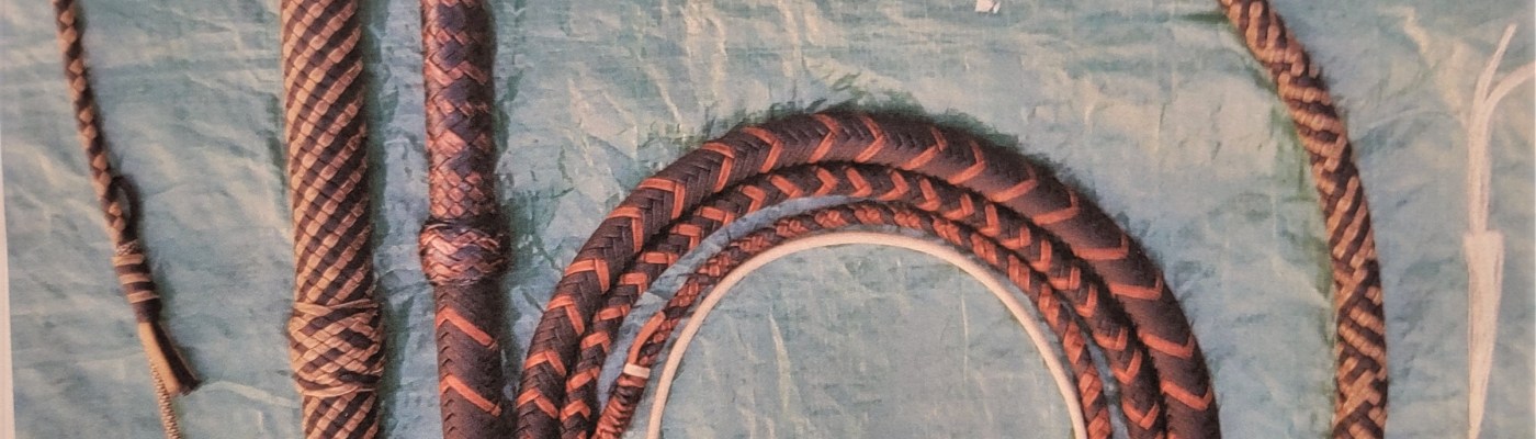 Now for the barber pole whip. First of all the plaiting is lovely, it starts as a 24-plait single diamond in a barber pole pattern. the pattern directions change where the strands are dropped. Also, at the drops, there are sections where strands go over 2, under 2 instead of O1U1, but it can’t be helped if you are going to maintain the barber pole effect. Unless you are specifically looking for them they aren’t that noticeable. the overall effect of the pattern of a moving optical illusion and very cool.