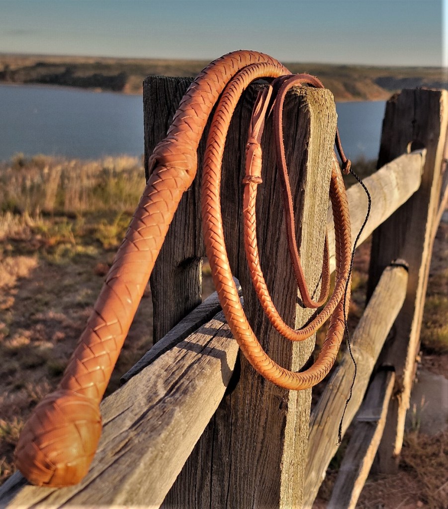 Whip #86 is a 6-foot, 12-plait, natural kangaroo hide whip with two plaited kangaroo hide bellies and two calfskin bolsters. The handle has an 8-inch 1/4″ steel rod center. It has a 30-inch latigo fall and a 12-inch nylon cracker. The heel knot is a 5×4, 3-pass Turk’s head knot over a lead and kangaroo hide and artificial sinew foundation. the transition knot is a 5×4, 2-pass THK. the handle is a single diamond plait with two wide bands in the middle. The transition of the thong is covered with a Gaucho plait that transitions to a herringbone. There is a short section of a birds-eye plait to break up the herringbone. the whip ends in an 8-strand fall hitch.
