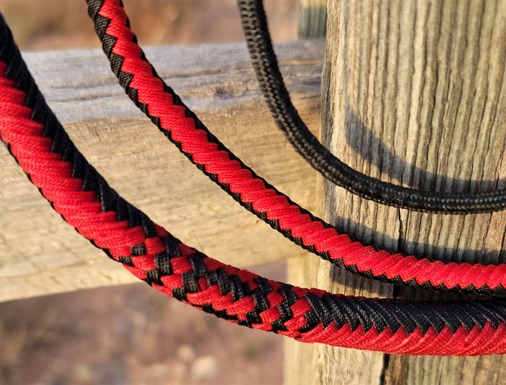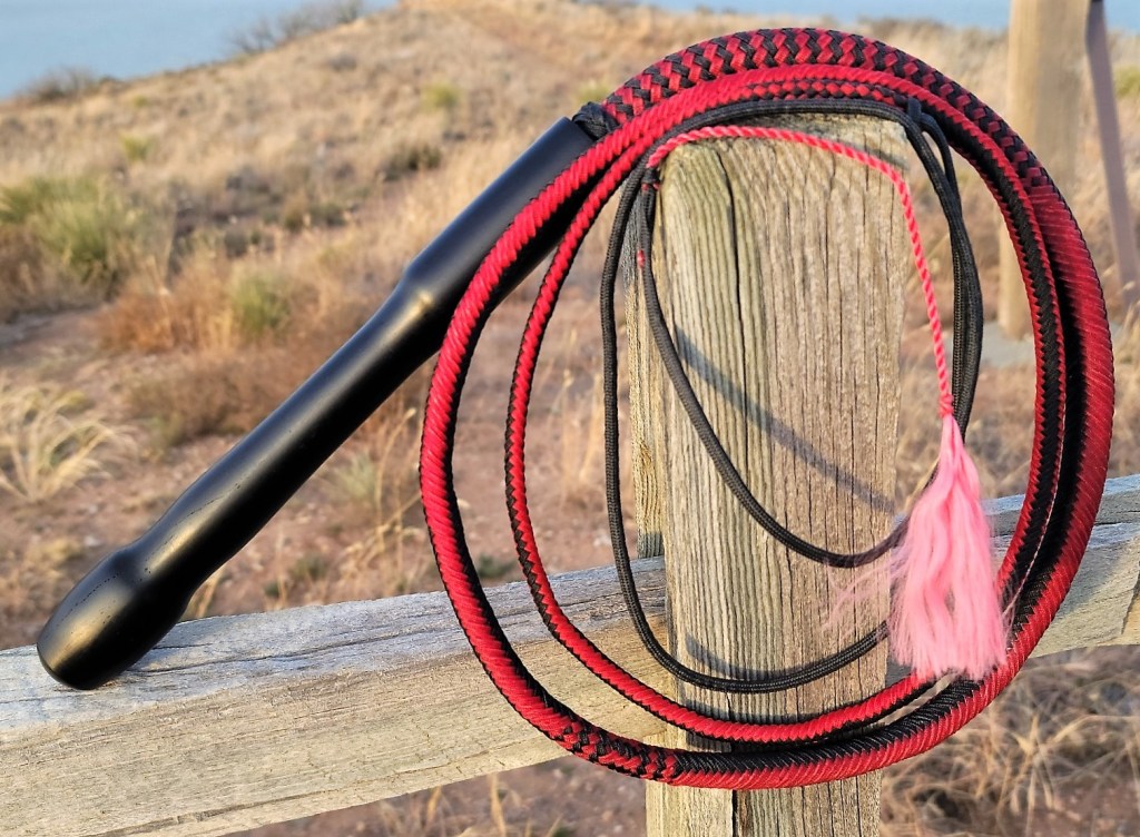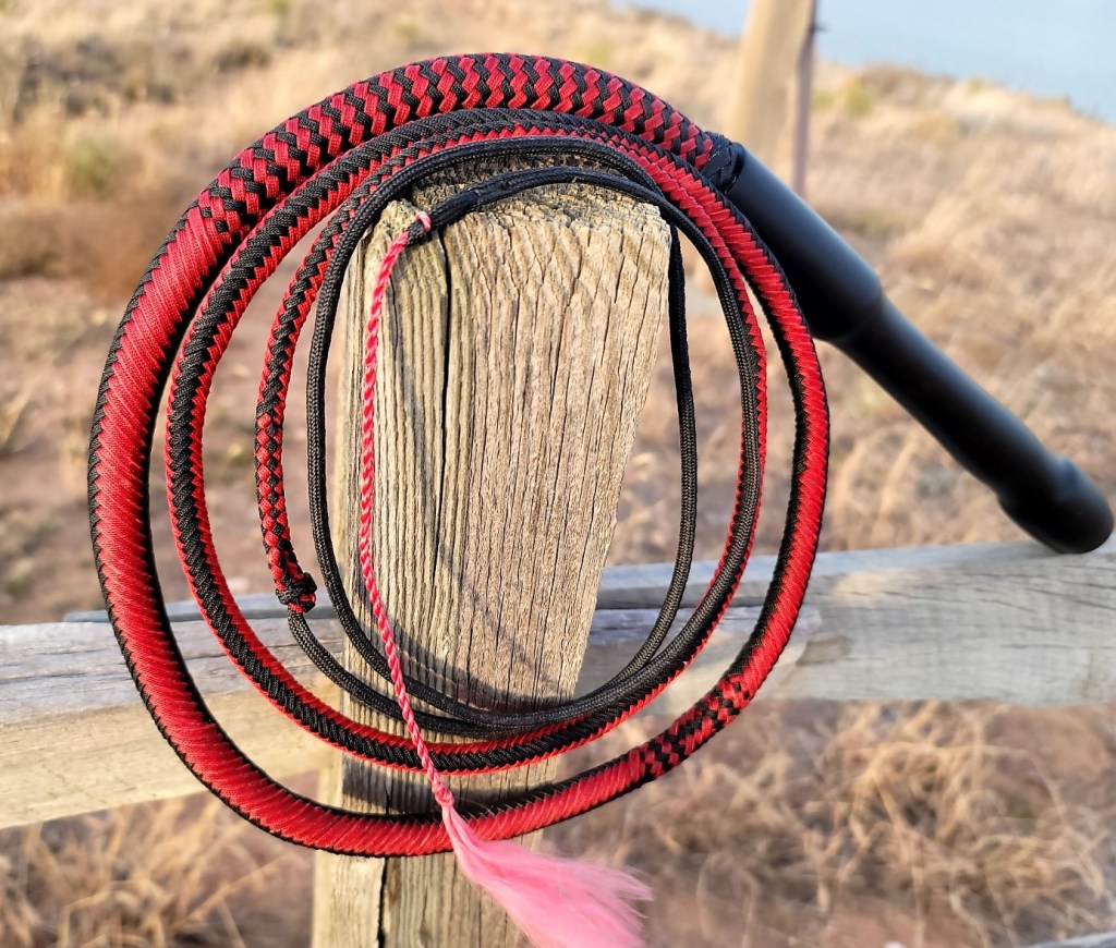 Here’s a 6-foot. 20-plait bullwhip made of red and black, 3/16=inch, nylon whipmaker’s cord with an 11-inch Indian Ebony handle. The core is 8 strands of ungutted, 550 paracord in varying lengths tied around a BB-filled foot-long length of 1100 paracord. It has an 8-strand plaited belly over the core. The whip ends in an 8-strand English eye fall hitch. It has a 28-inch weighted, double-loop paracord fall and a 10-inch cracker made of B55 nylon cord. The whip is waxed. This is whip #91.