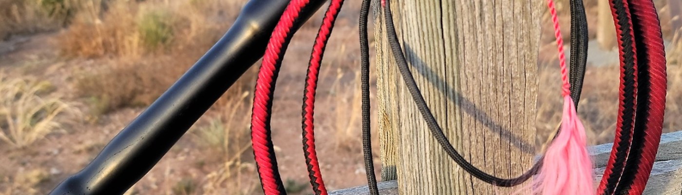 Here’s a 6-foot. 20-plait bullwhip made of red and black, 3/16=inch, nylon whipmaker’s cord with an 11-inch Indian Ebony handle. The core is 8 strands of ungutted, 550 paracord in varying lengths tied around a BB-filled foot-long length of 1100 paracord. It has an 8-strand plaited belly over the core. The whip ends in an 8-strand English eye fall hitch. It has a 28-inch weighted, double-loop paracord fall and a 10-inch cracker made of B55 nylon cord. The whip is waxed. This is whip #91.