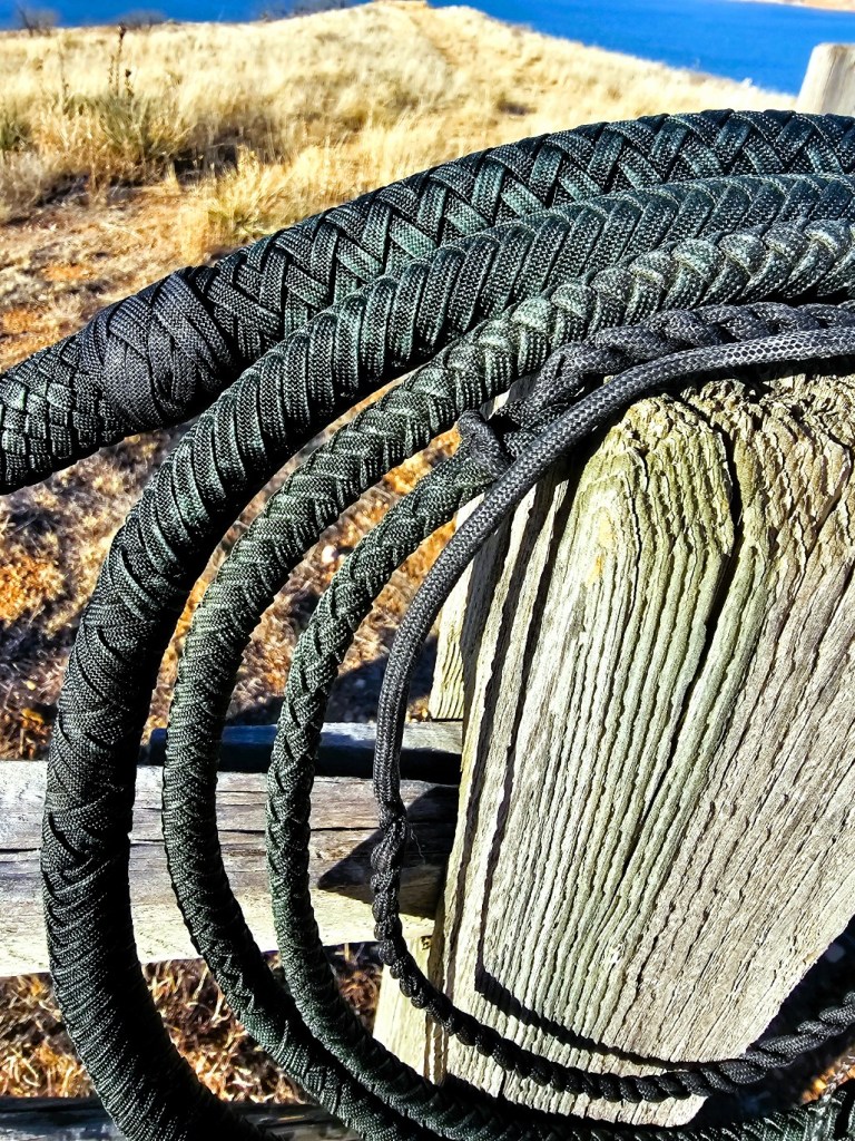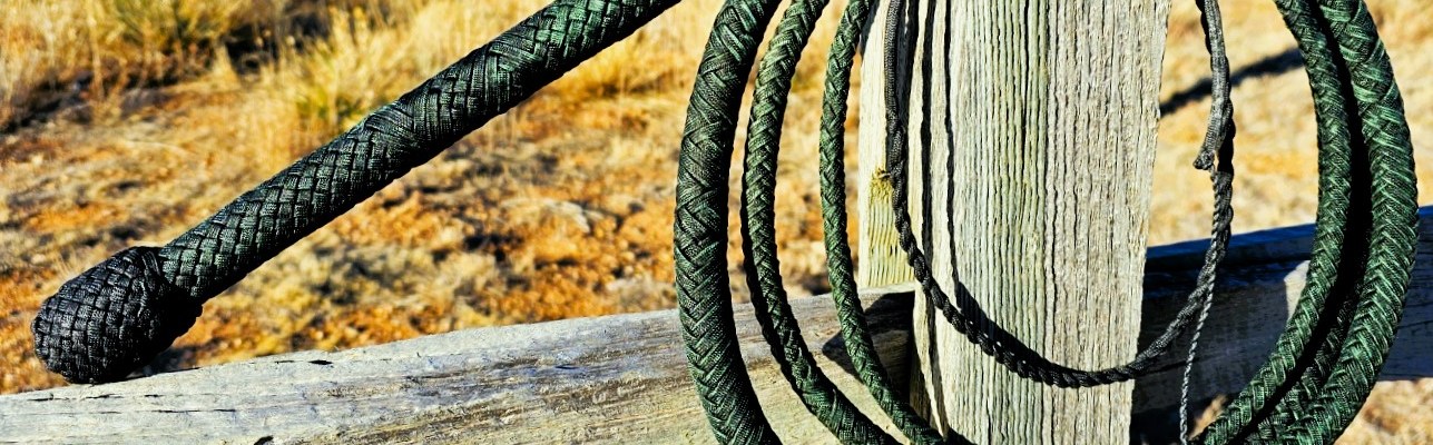 Whip #97 is a 9-foot 20 plait bullwhip in emerald green paracord with 3 plaited bellies around a twisted-tapered core. The handle is built around a 12-inch long 3/8″ spring steel rod. It has a 3-strand English eye fall hitch, a 32-inch twisted-tapered fall, and a 10-inch cracker. The whip is waxed. The wax really darkened the paracord and as it was cracked, the whip took on a camo-like patina. I think it will lighten as it is used. The heel knot, transition knot, and the fall are the only actually black parts.