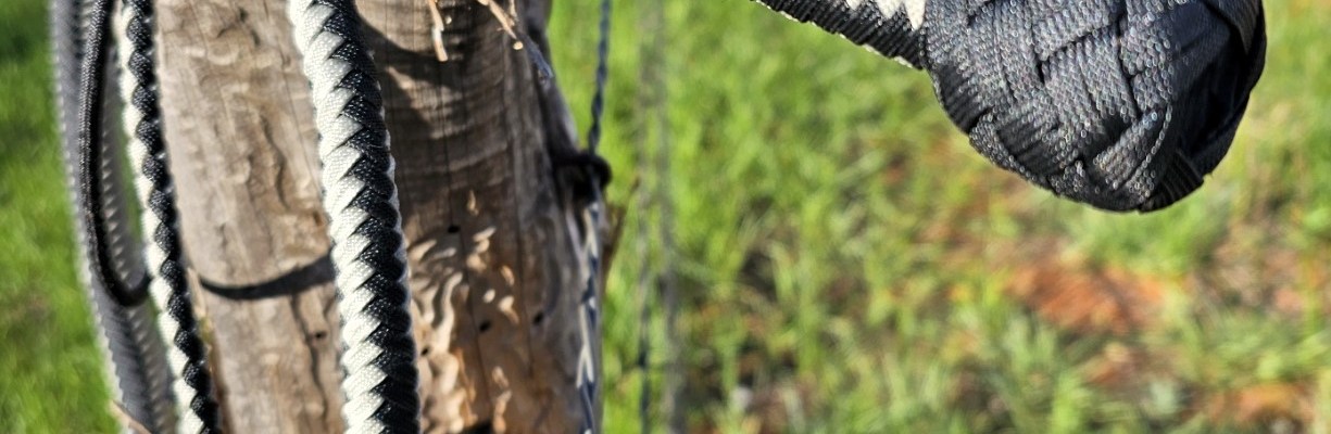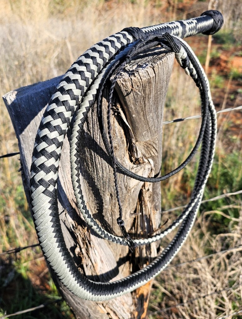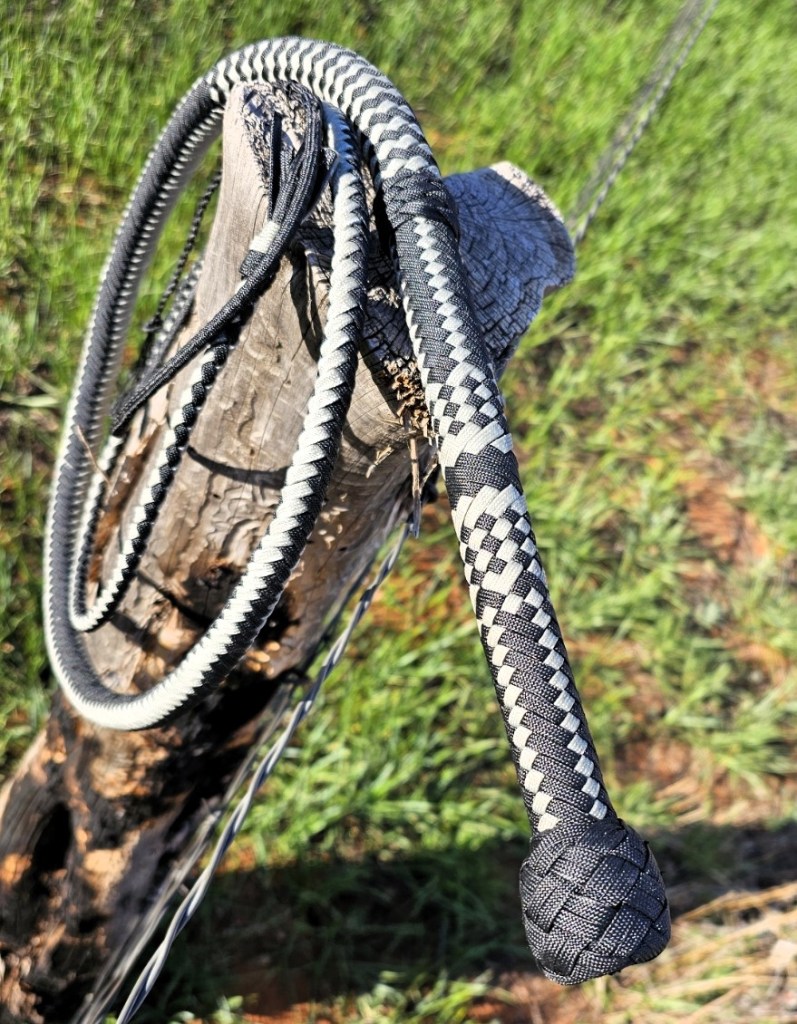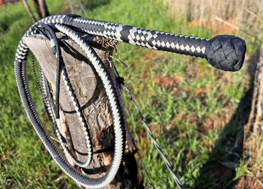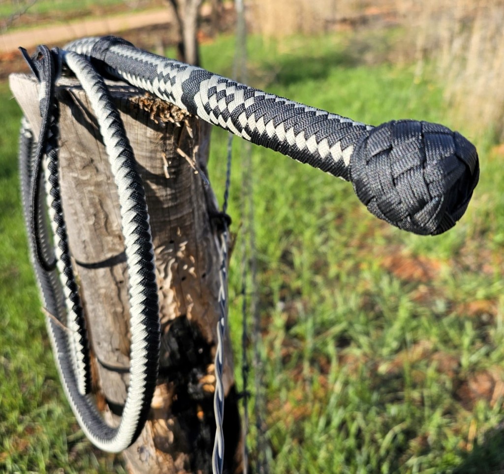 Whip #99 is a 6-foot paracord bullwhip with a single belly around a loose strand core. It has a 16-plait overlay in black and silver. The handle is built around a 10-inch spring steel rod, a 24-inch double-loop, weighted fall, and a 10-inch B-55 nylon cracker. The whip is waxed.
