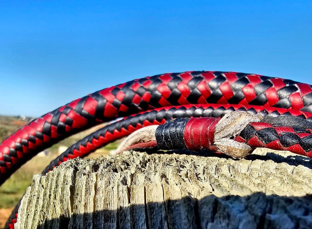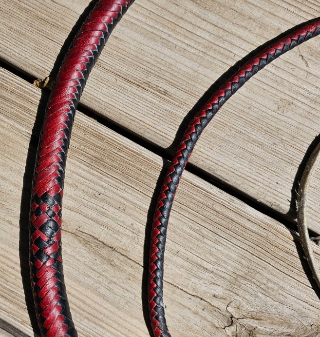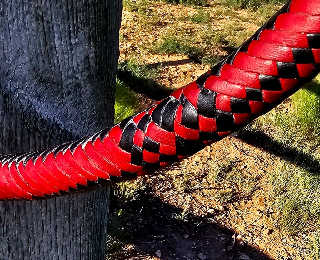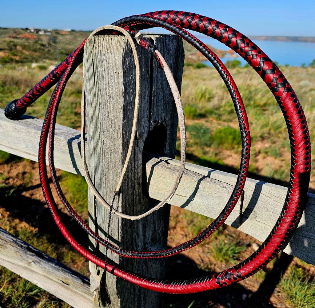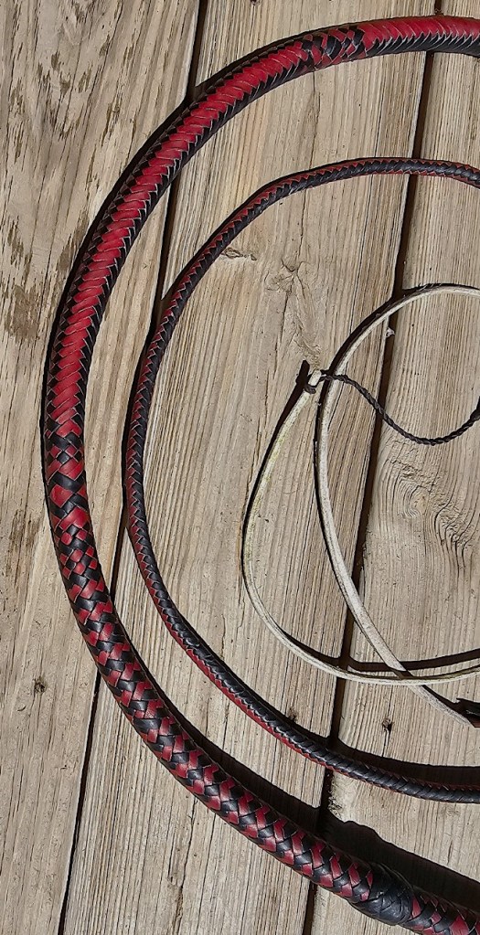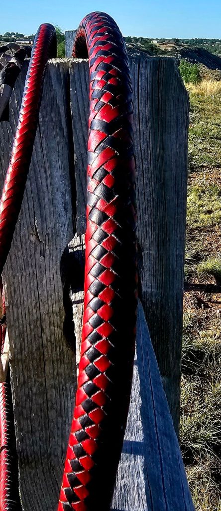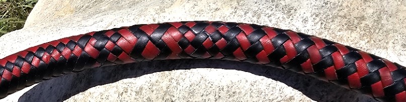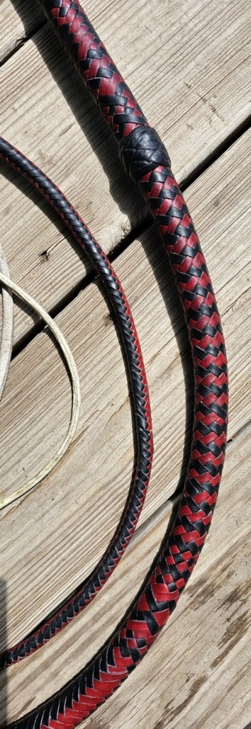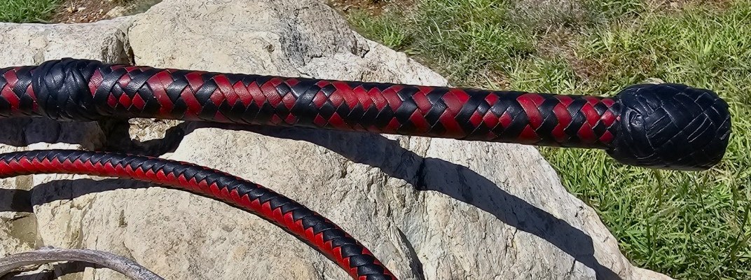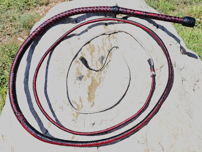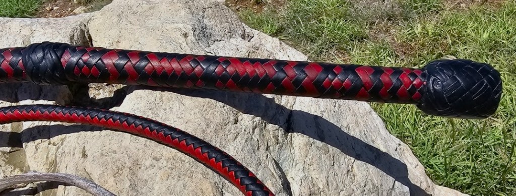 Here’s a 9-foot, kangaroo hide bullwhip with a 16-plait red and black overlay. It has a latigo core, 2 plaited bellies, and 2 calf skin bolsters. The white hide fall is 36 inches long and was made by Alysum Iris of Iris Whips. It has a 10-inch B55 nylon cracker. The handle is 10 inches long with a 7×6, 3-pass, Turk’s head heel knot on a lead foundation. The transition knot is a 5×4, 2-pass, Turk’s head knot.