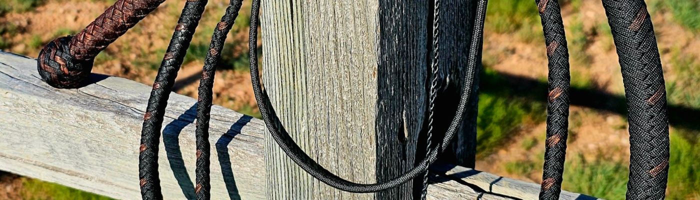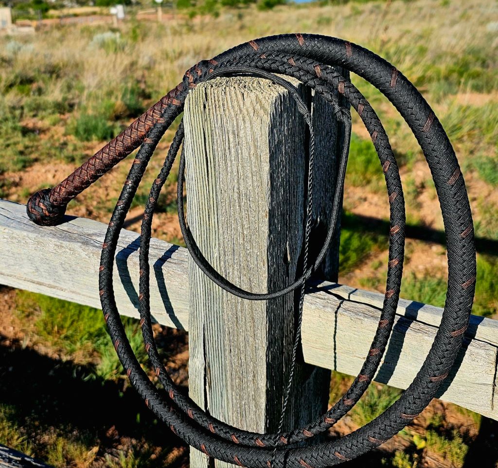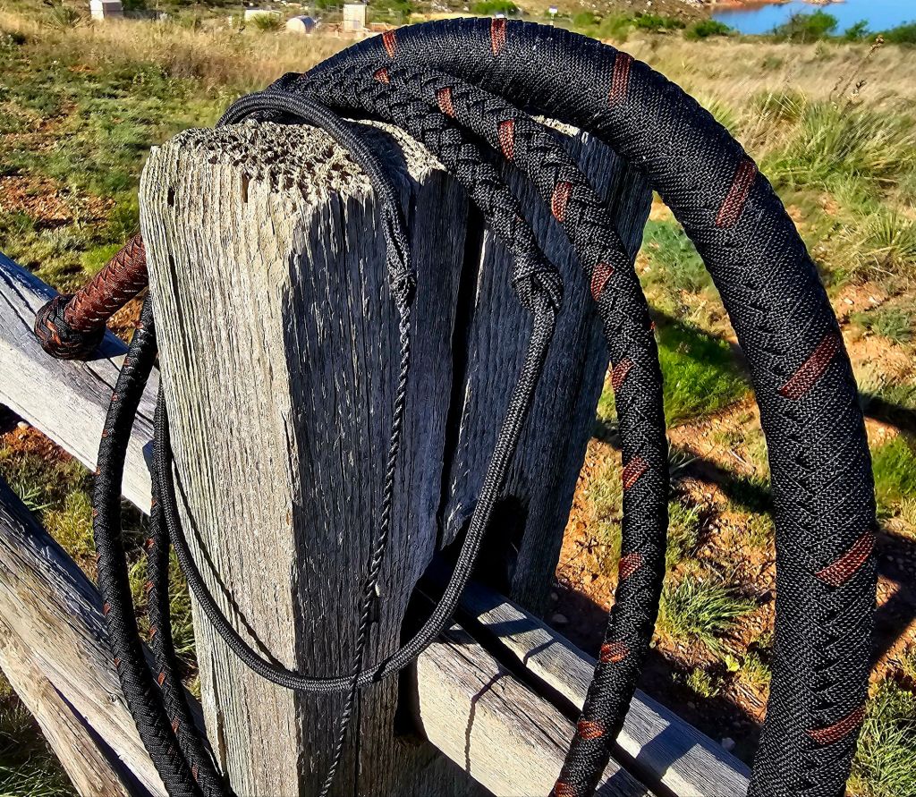 7 ft black and rust, 16-plait, nylon bull whip with a loaded core, and and a Winrich-style single belly. It has a 22-inch double loop, weighted fall and a 10-inch nylon cracker. The heel knot foundation is lead with a 7×6 pineapple knot. The transition knot is the same but without the lead.
